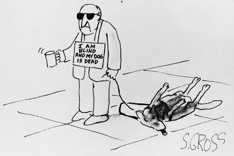 "I am blind and my dog is dead". Sam Gross cartoon.