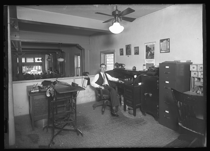 View of the upstairs office of Biel's Self-Service Grocery located at 416 Starr Street in Corpus Christi, Texas. Owner Emil Biel, sits at a large wooden desk. The office also contains a filing cabinet and smaller desk with an adding machine. This upstairs office was located in the rear of the store and can be also seen in the background of negative 976:0021:0126. Such offices were common in the first self-serve grocery stores so that shoplifters could be spotted more easily.